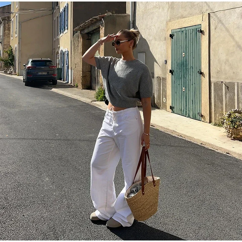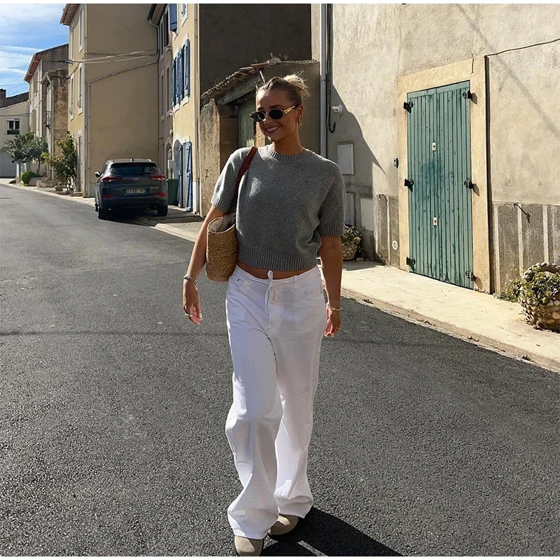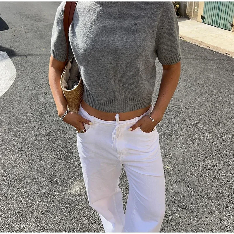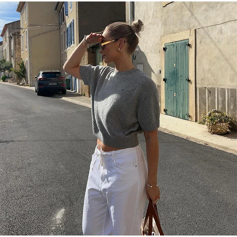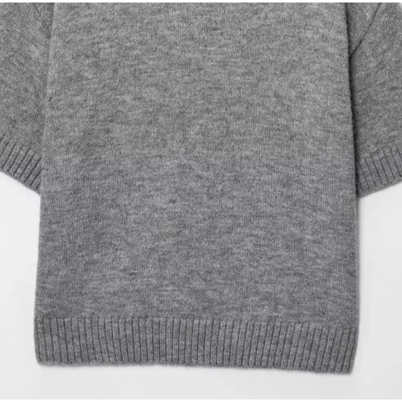 A timeless staple with a refined finish. The Elina Lightweight Knit Sweater features a classic O-neck and short sleeves, crafted in a smart grey hue. Ribbed detailing at the collar, sleeve hems, and bottom edge adds subtle structure to this versatile piece.