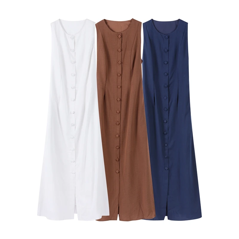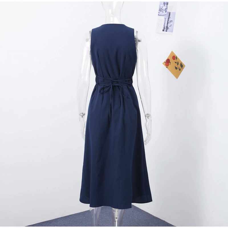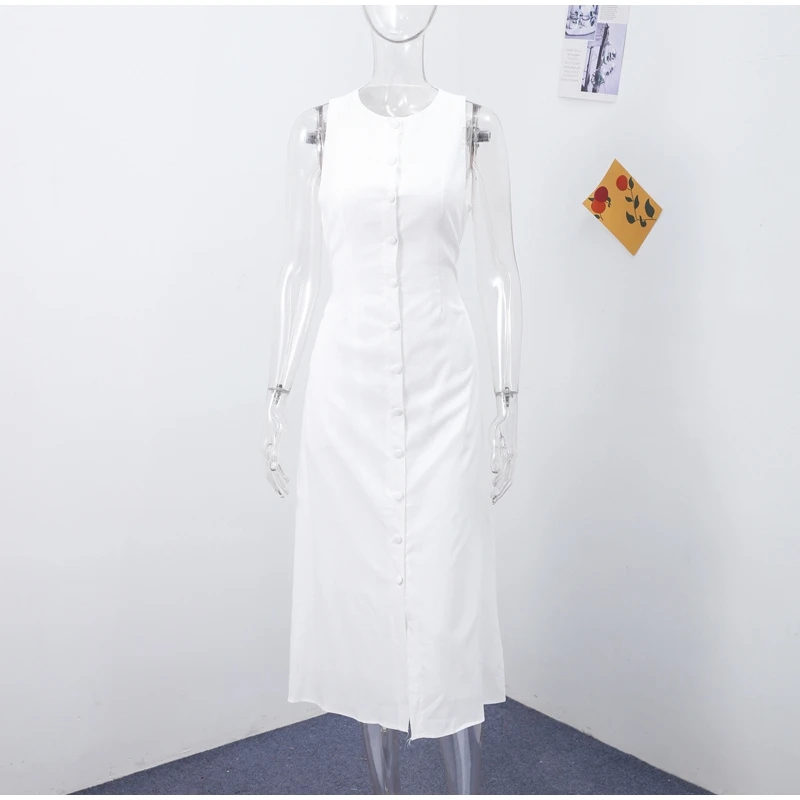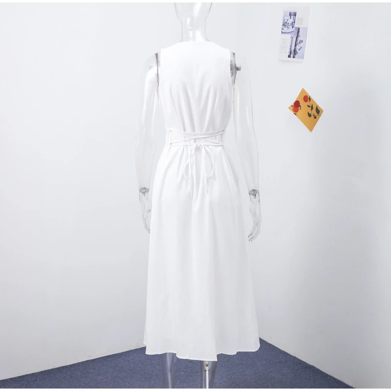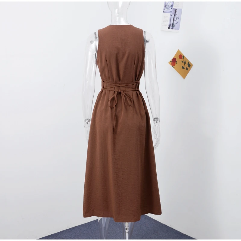 A resort-ready essential with refined sophistication. The Marivelle Lace-Up Resort Dress features a button-down midi silhouette in chocolate brown or crisp white, fully lined for coverage without sheerness. Its O-neckline and sleeveless design create a clean, classic look, while the corset-style lace-up back cinches the waist for a flattering fit and flows into a perfectly tailored A-line skirt.