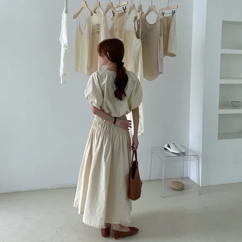 Two-piece set featuring a puff-sleeve crop top and long A-line skirt