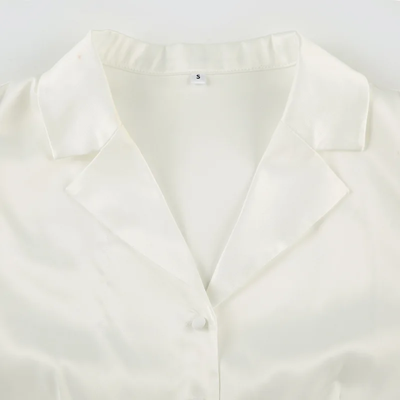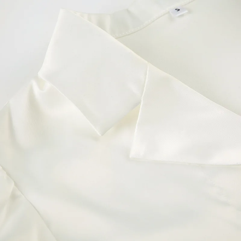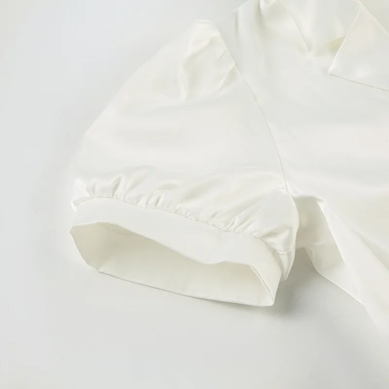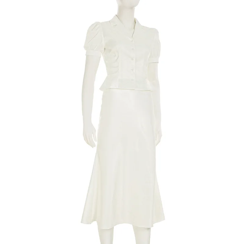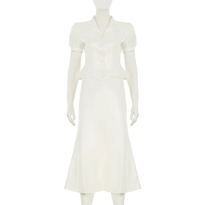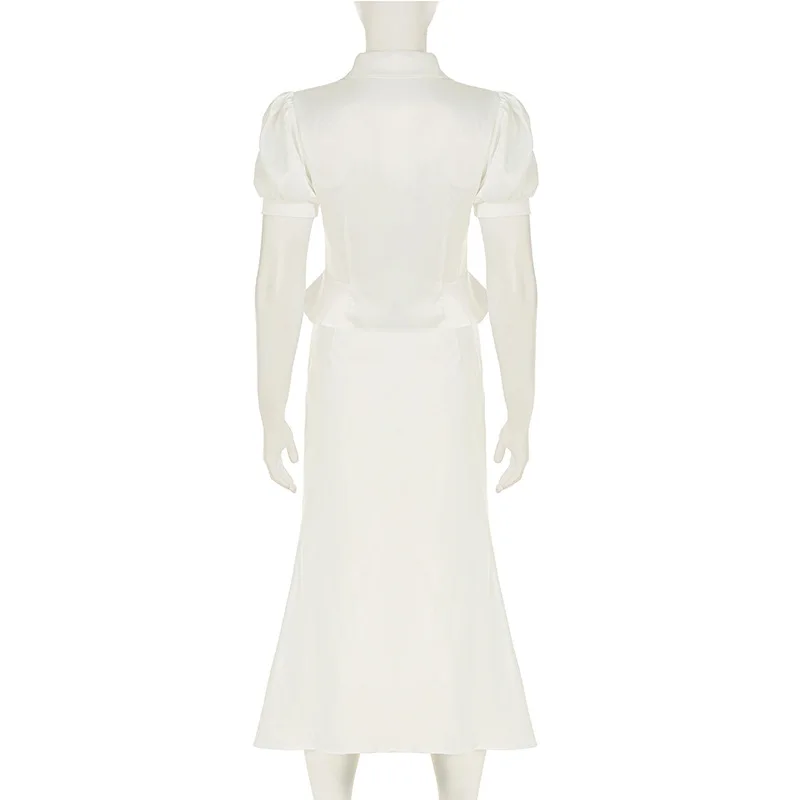 Chic, clean, and effortlessly elegant. This two-piece set features a tailored short-sleeve top with playful puff sleeves and five crisp white buttons for a flattering fit. The matching A-line midi skirt flares beautifully toward the hem, fully lined for comfort and opacity, creating a refined silhouette that balances sophistication with a touch of whimsy.