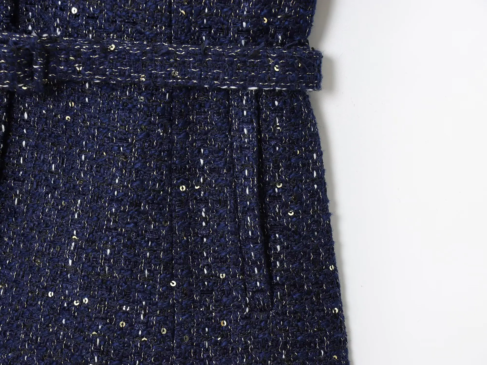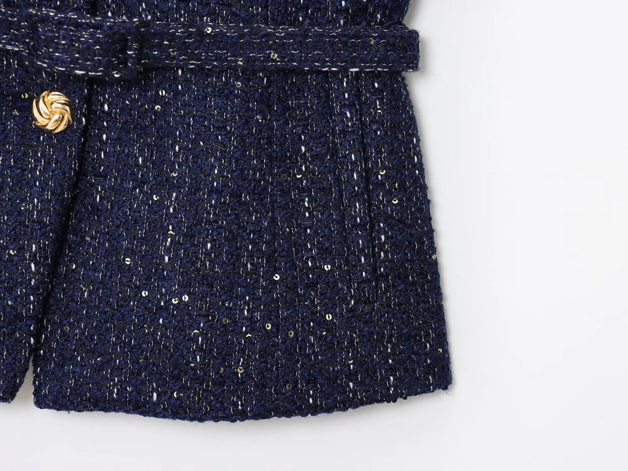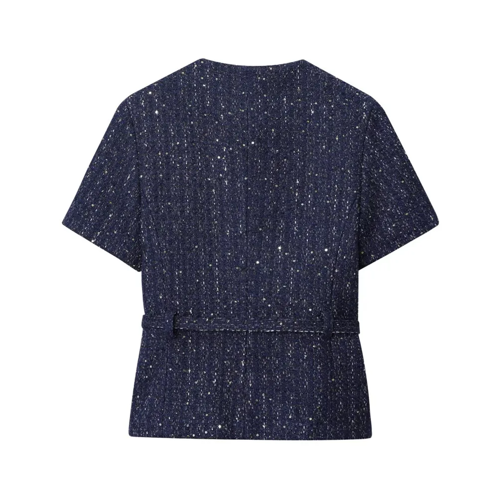 Crafted from soft navy tweed with subtle glitter threads for a luminous finish