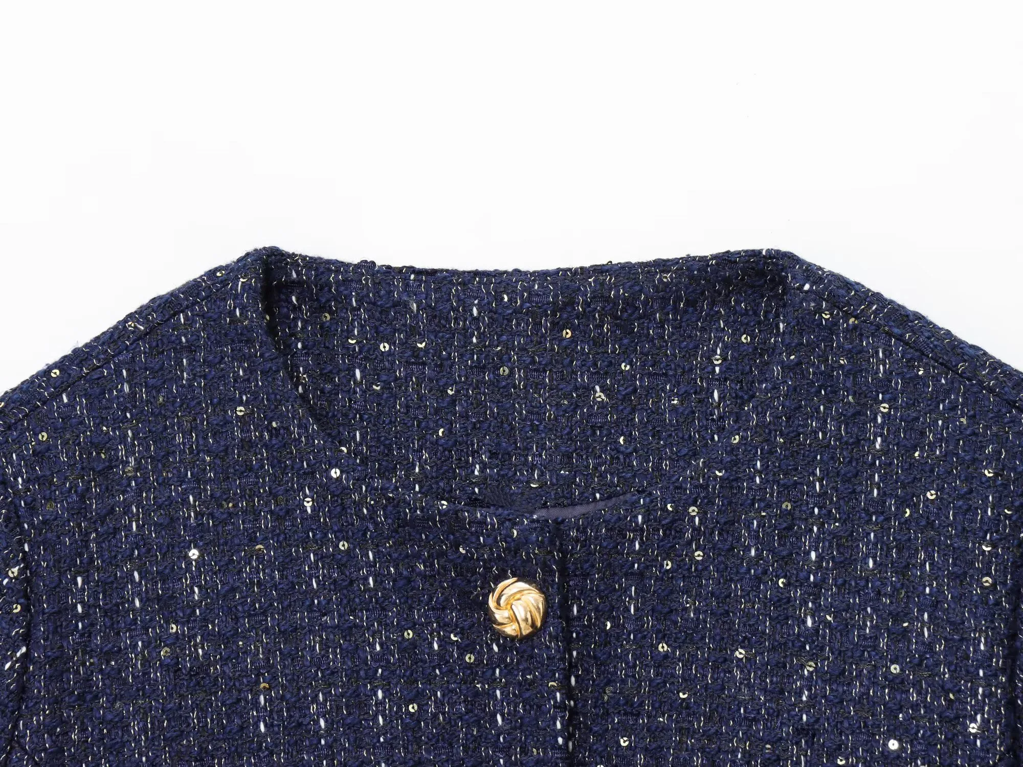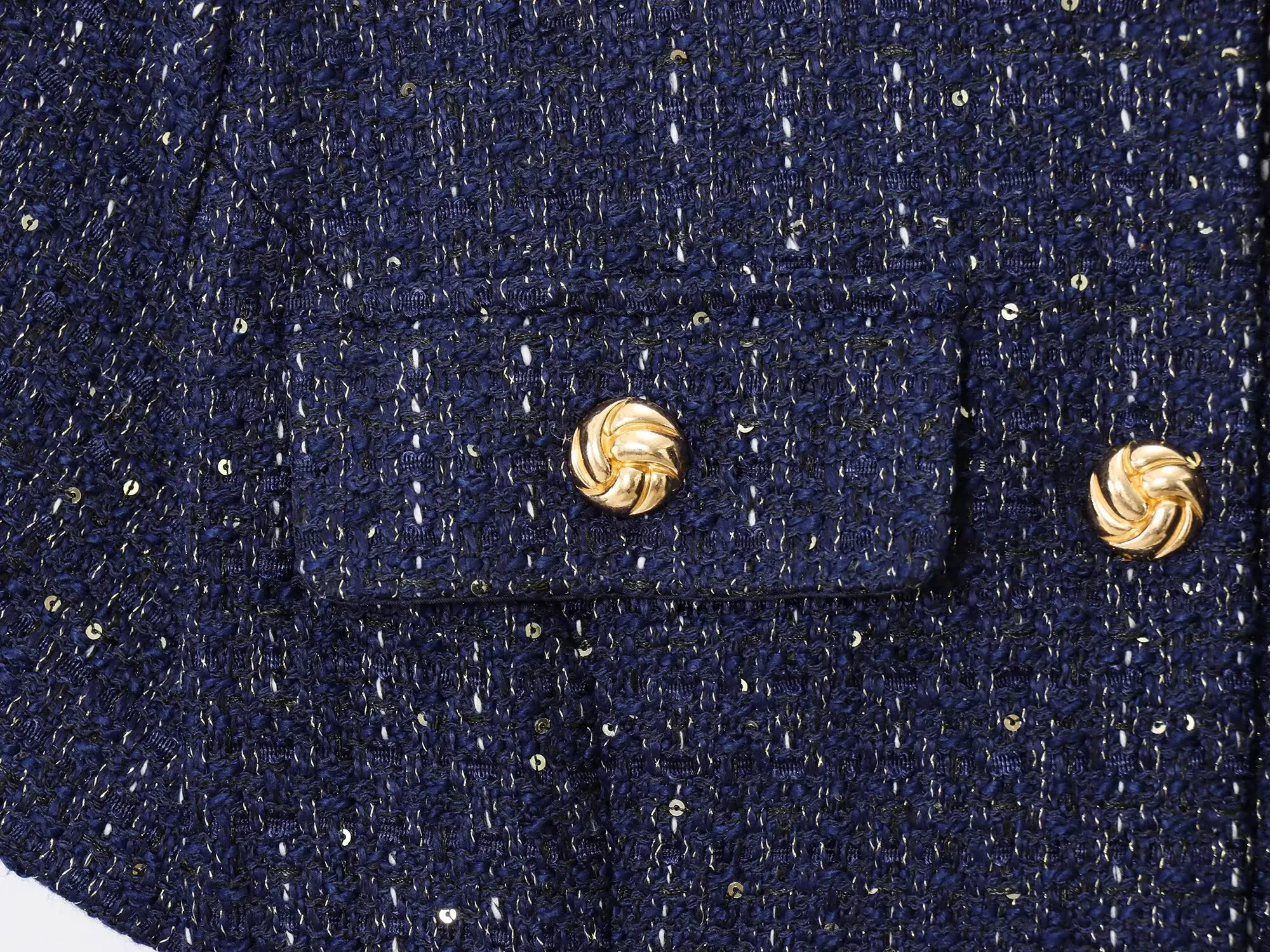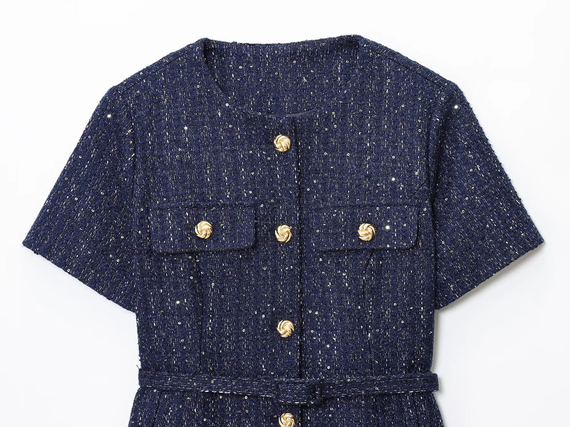 Crafted from soft navy tweed with subtle glitter threads for a luminous finish