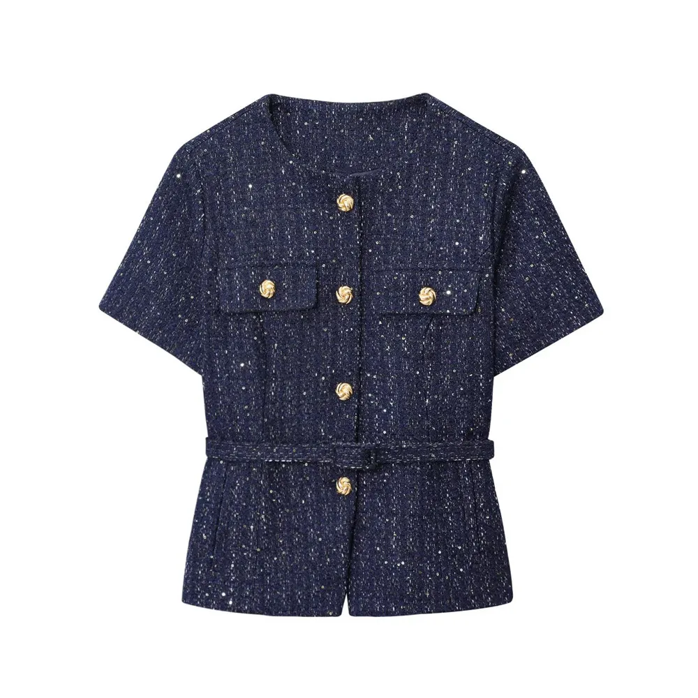 A refined take on classic tailoring, the Delvaux Coat in Deep Navy captures timeless sophistication with a touch of shimmer. Crafted from textured tweed interwoven with glittering threads, it radiates quiet luxury while maintaining structure and poise. Gold rope-twist buttons and a slim, tonal belt accentuate its feminine shape, creating a silhouette that feels both modern and enduring.