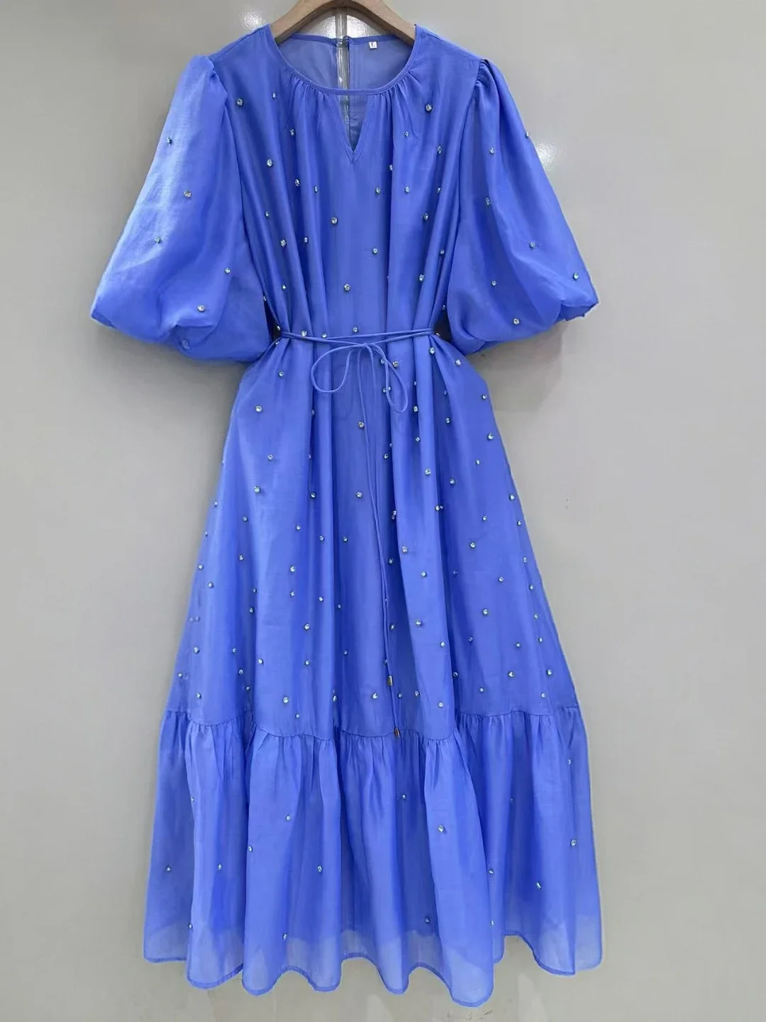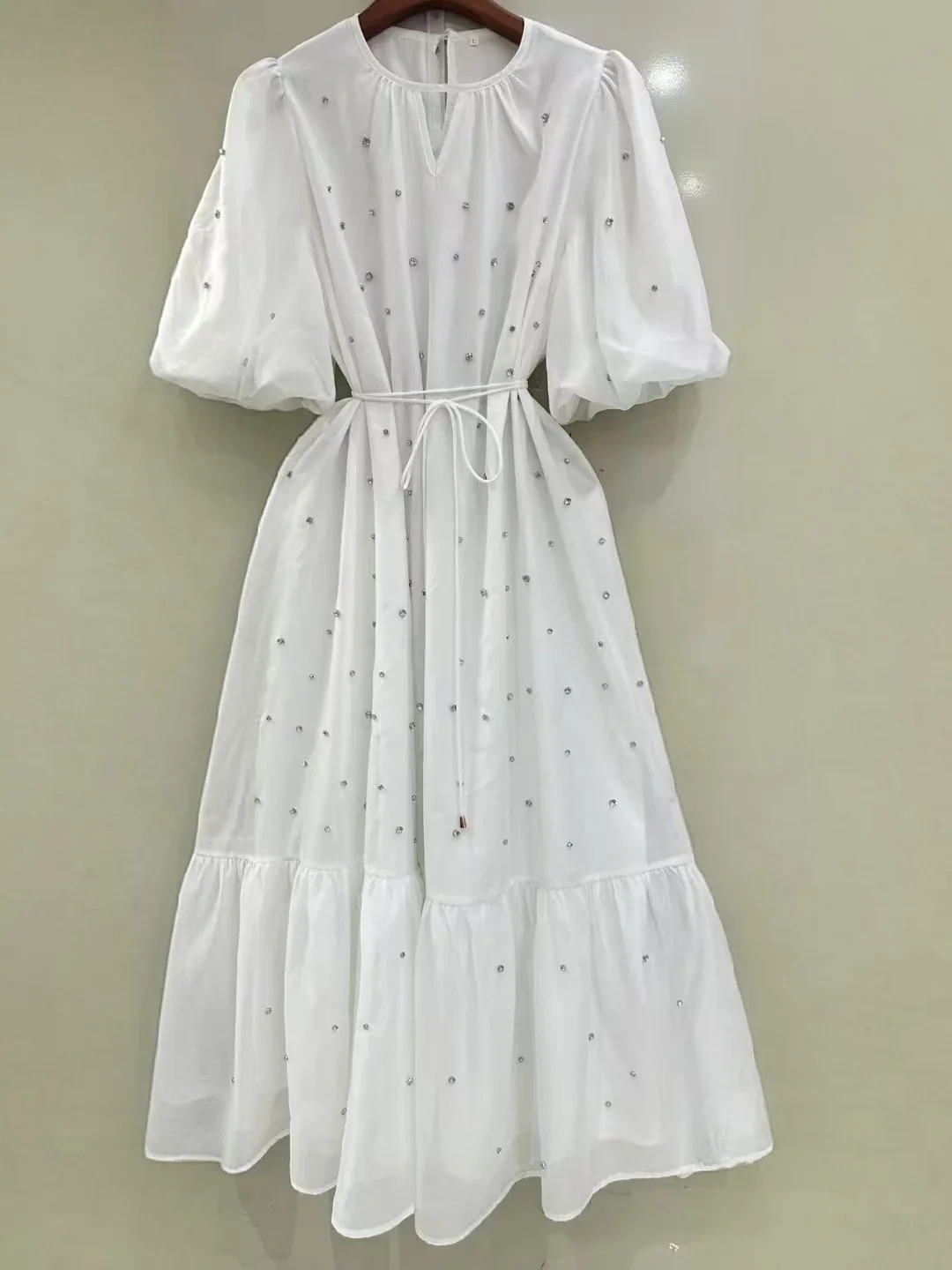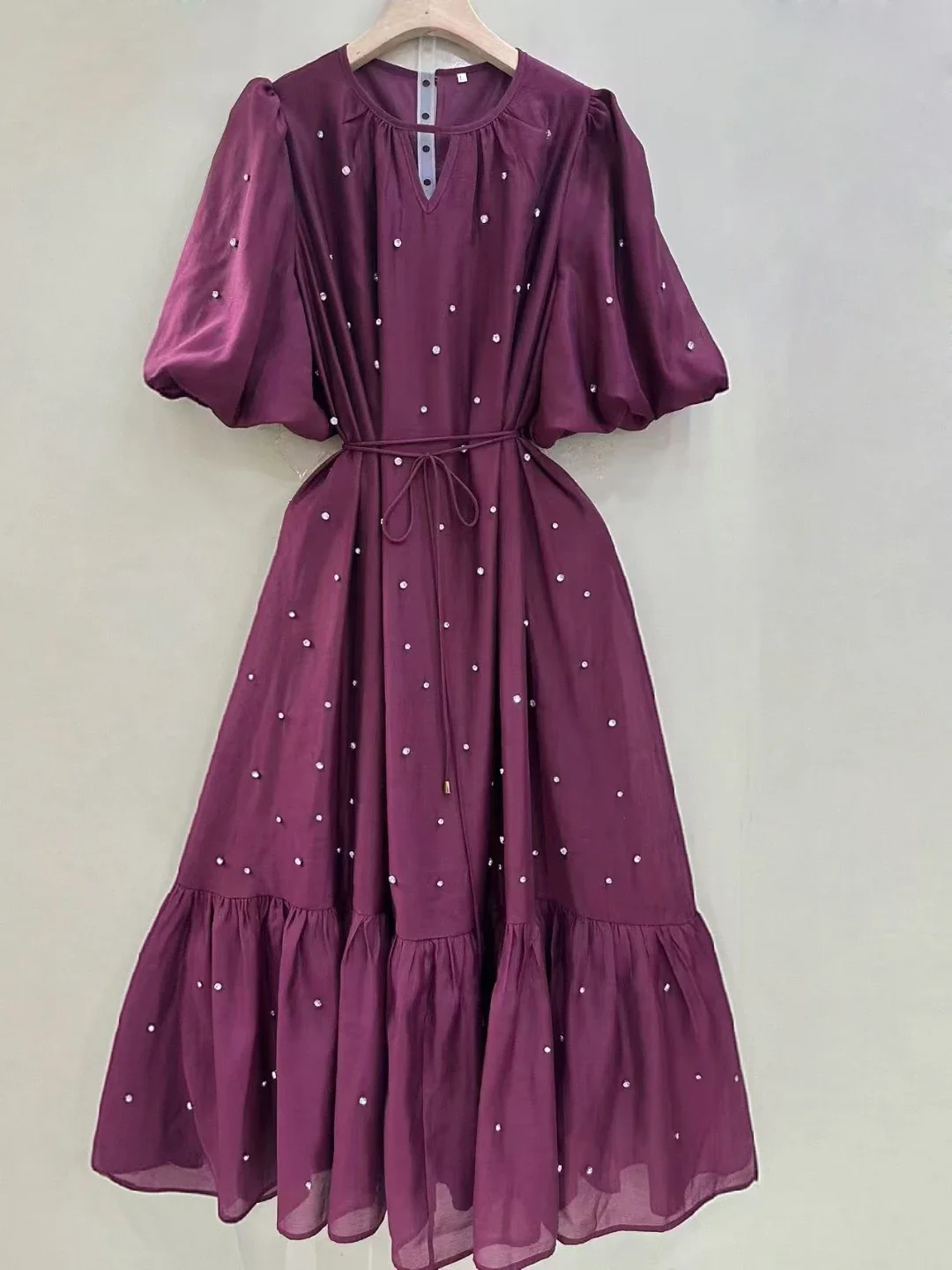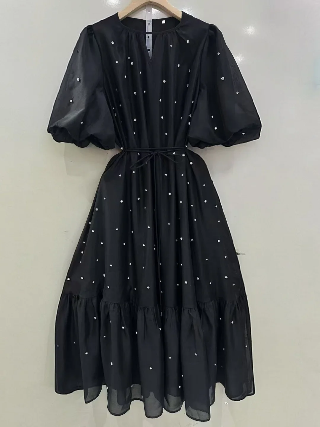 A radiant expression of vintage glamour, this sparkling beaded midi dress captures timeless beauty with a modern twist. Crafted from smooth woven polyester, it features intricate rhinestone-like beadwork that shimmers with every movement. The puff sleeves and tie waist create a flattering A-line shape, while the soft ruffle hem adds a touch of romantic charm.