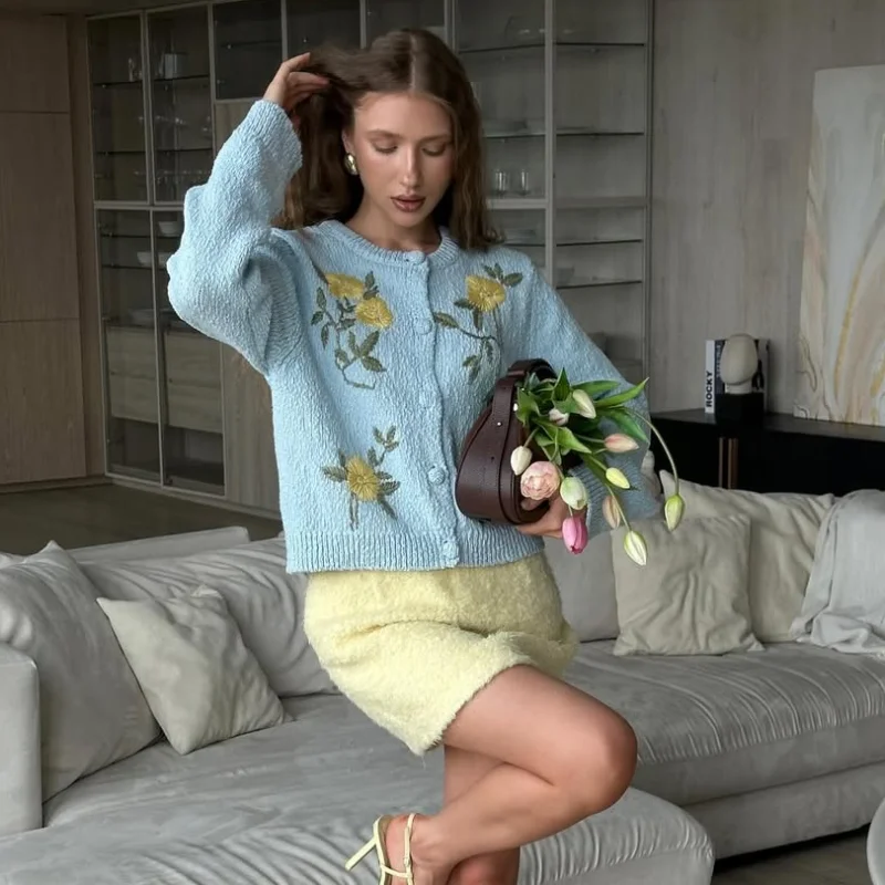 The Florabelle Cardigan is a statement of understated elegance and artistry. In a soft, plush blue knit, it exudes warmth and refinement while maintaining a smooth, polished finish. Dainty yellow embroidered flowers with green stems trace the neckline and hem, perfectly coordinating with the rich blue for a harmonious, exquisite look. Classic O-neck styling and a full-length button closure complete this timeless piece, blending comfort with undeniable sophistication.
