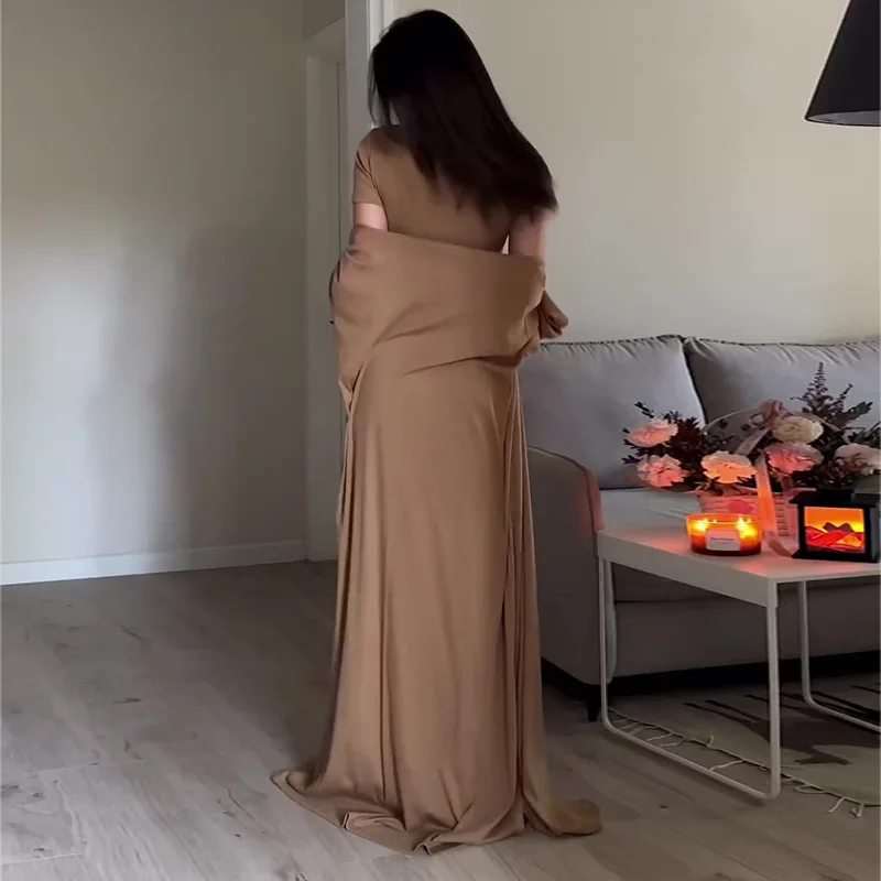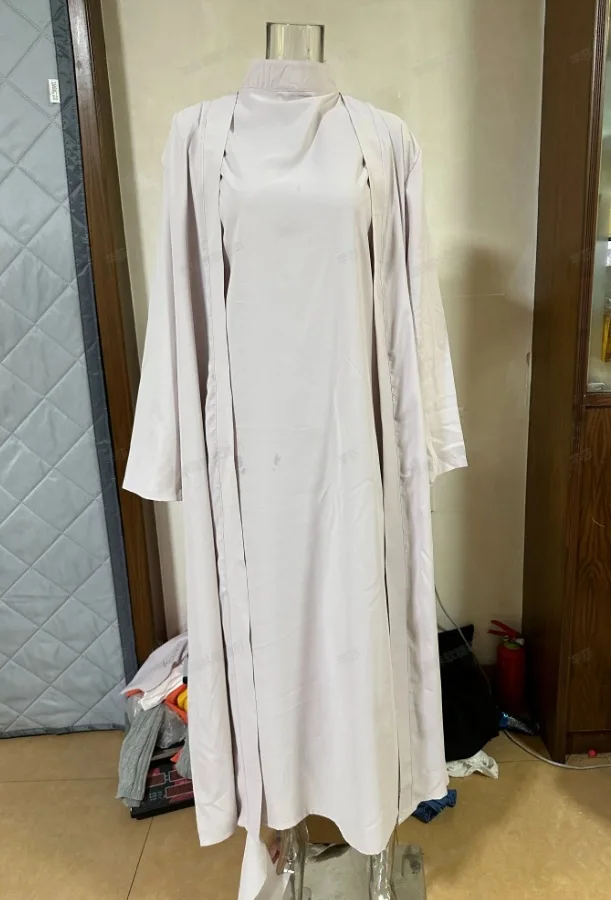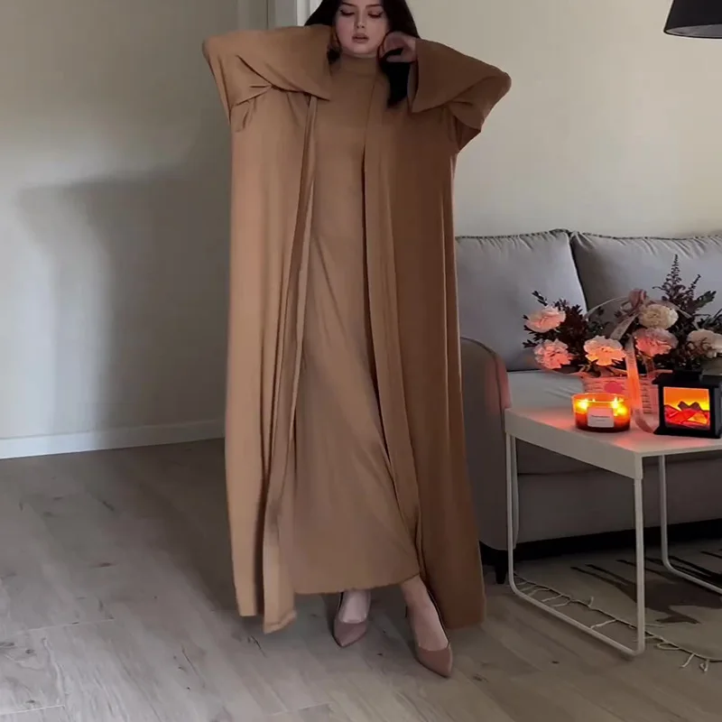 The Zaria Two-Piece Flowing Set captures modern elegance with a touch of effortless modesty. This beautifully coordinated duo features a form-fitting turtleneck dress that flatters the figure with its soft stretch and smooth drape. Layered atop is a flowing open-front cardigan with wide, sweeping bell sleeves — creating graceful movement and an aura of understated luxury. Available in off-white, grey, and camel for timeless versatility.